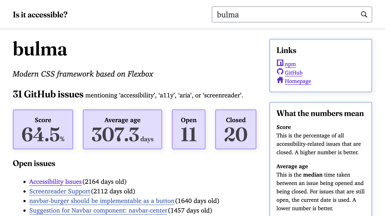 A search engine for npm packages with a twist: using data from GitHub issues, it gives an overview of accessibility problems to help you choose the right package.